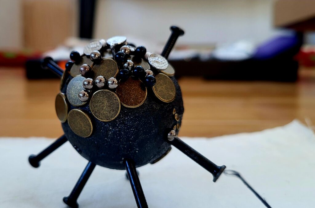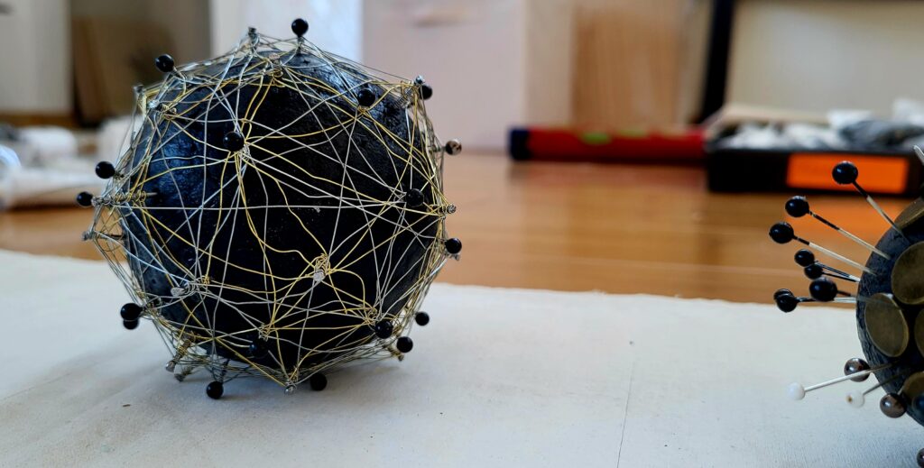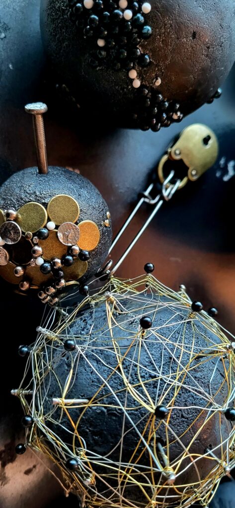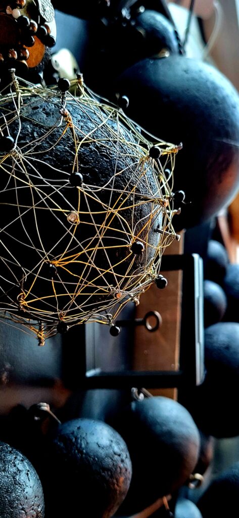 Rather than staging anxiety as a personal shortcoming, the exhibition exposes it as a systemic condition. The accumulation of black spheres, punctured by pins, wire, and corroded metal, constructs an environment in which protection turns aggressive, and safety becomes indistinguishable from threat. These forms do not merely occupy the space, they proliferate within it, suggesting a process closer to metastasis than to composition.